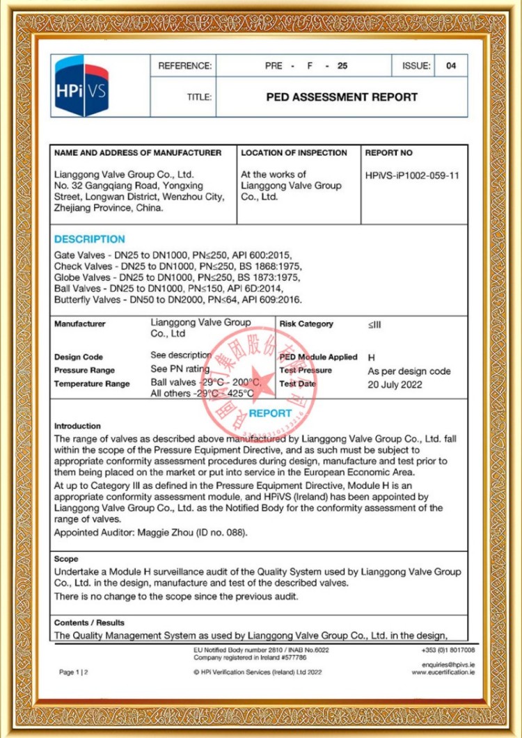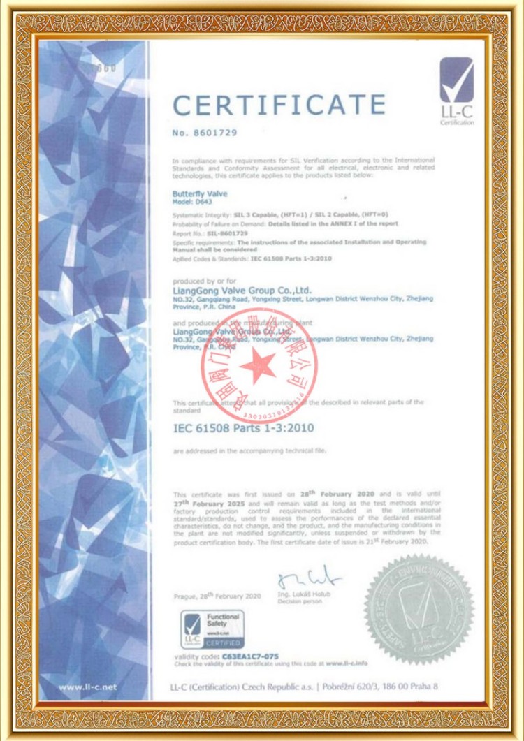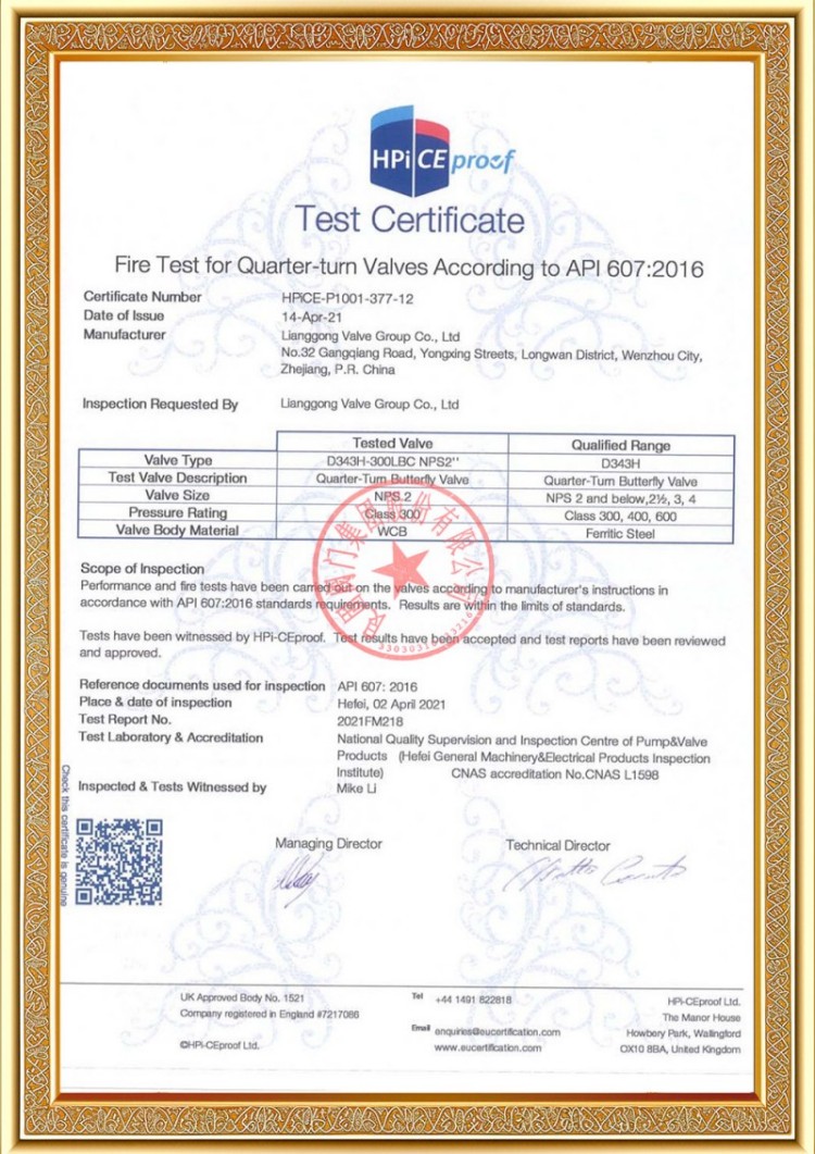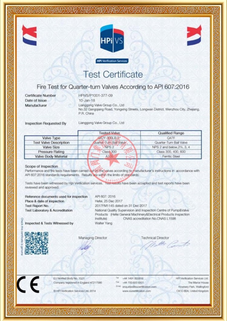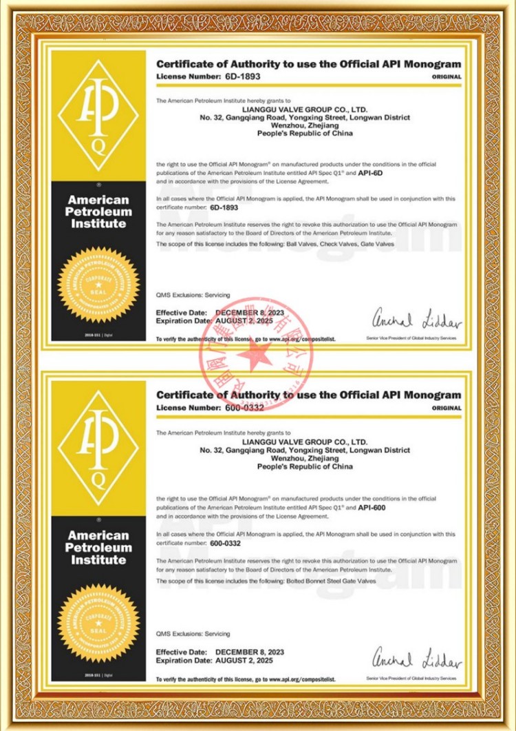 Compania noastră are diverse licențe de producție de supape de conducte de presiune, iar produsele noastre au trecut TS A1, ISO 9001, ISO 14001, ISO 45001, API 6D, API 600, APL 609, CE/PED, API 607, API 6FA, ISO 15848-1 și certificarea produsului și EAC. Avem, de asemenea, certificate de brevet de invenție pentru diferite supape, cum ar fi supape cu bilă, supape fluture, supape de siguranță și supape de oprire.